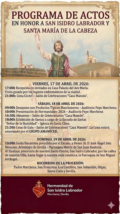 Más allá de los actos litúrgicos, el congreso ofrece una completa agenda para dar a conocer las bondades de Marchena. Los asistentes disfrutarán de una recepción oficial en la Casa Palacio del Ave María y desayunos con productos típicos en el auditorio Pepe Marchena. La programación incluye también una exhibición de saetas en la iglesia de Santa Clara a cargo de la escuela local, uniendo así la tradición jacobea y agrícola con el arte flamenco. El evento concluirá tras tres días de convivencia que refuerzan los vínculos entre las distintas corporaciones de San Isidro de toda España.