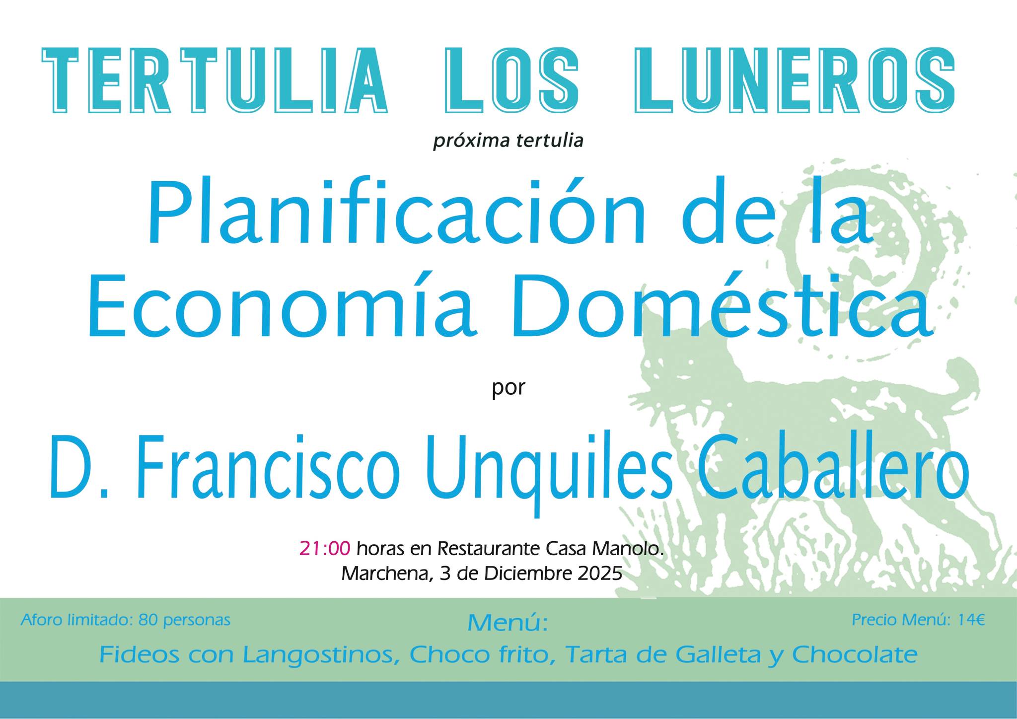 La tertulia 'Los Luneros' celebrará en Marchena una nueva sesión dedicada a la planificación de la economía doméstica, una temática que será desarrollada por Francisco Unquiles Caballero el próximo miércoles 3 de diciembre en Restaurante Casa Manolo a las 21:00 horas.