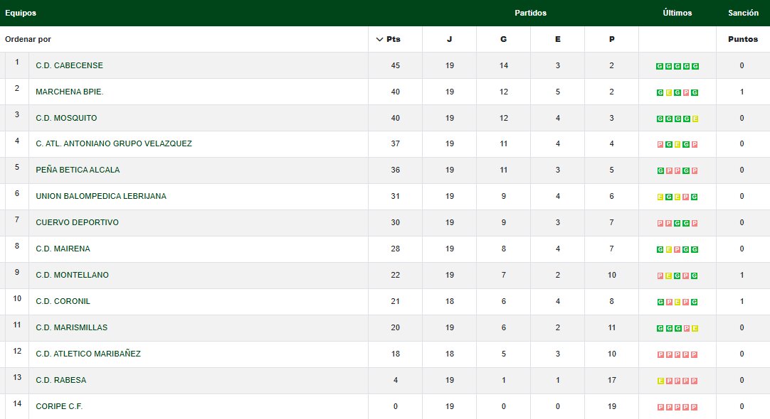 Con esta victoria, el Marchena Balompié se coloca en la segunda posición de la clasificación con 40 puntos, empatado con el C.D. Mosquito y recortando distancias con el líder.