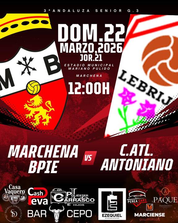 El Marchena Balompié se enfrenta este domingo 22 de marzo a las doce de la mañana al Club Atlético Antoniano en el Estadio 'Mariano Pulido', en un duelo correspondiente a la jornada 21 de la Tercera Andaluza Senior. Desde el club realizan un llamamiento a todos los aficionados para convertir las gradas en una caldera y conseguir un impulso en su camino hacia el ascenso.