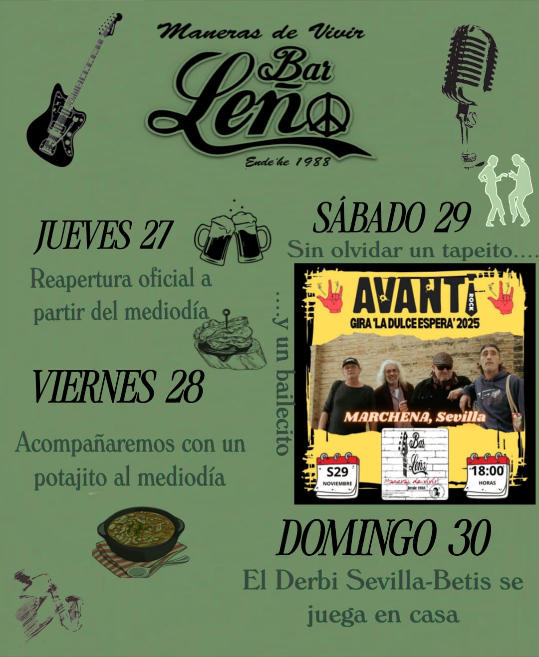 El sábado, desde el mediodía, el local ofrecerá aperitivos especiales y un concierto tributo al mítico Silvio, con la banda ‘Avanti’ dentro de la gira ‘La dulce espera 2025’. El domingo, el bar animará la jornada con el derbi Sevilla–Betis, que podrá seguirse en el propio establecimiento, completando así un fin de semana de reapertura pensado para todos los públicos.
