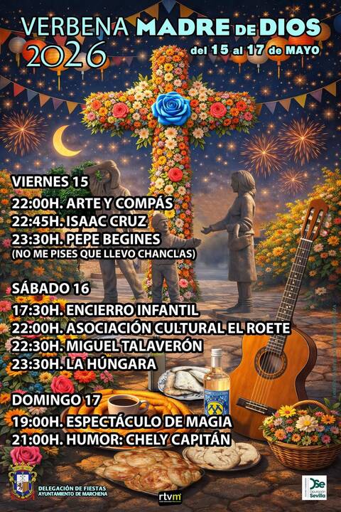 La programación continuará el 16 de mayo con una apuesta por la identidad local y el folclore. A las 22:00 horas, la Asociación Cultural El Roete presentará su propuesta artística, seguida a las 22:30 horas por la actuación de Miguel Talaverón. Bajo el título "De la Vega a la Campiña", el bailaor pondrá en escena una producción que explora las raíces del territorio a través del movimiento, consolidando la presencia de las asociaciones y artistas del entorno en el escaparate cultural que supone la Verbena Madre de Dios.