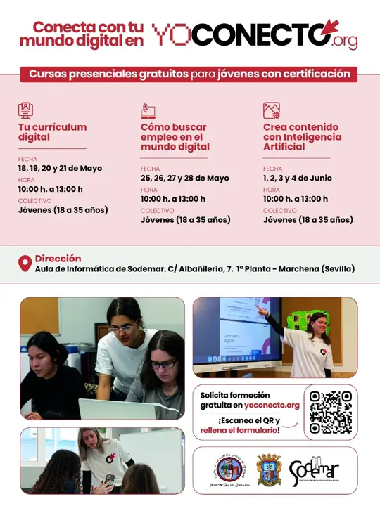 Para participar en estas jornadas gratuitas, los interesados deben realizar su solicitud a través de la web yoconecto.org o escaneando el código QR habilitado en el cartel informativo. El único requisito es pertenecer al colectivo de jóvenes de entre 18 y 35 años. Al ser plazas limitadas y de carácter presencial en Marchena, se recomienda formalizar la inscripción a la mayor brevedad para asegurar el acceso a esta formación que combina la orientación laboral con la vanguardia tecnológica.