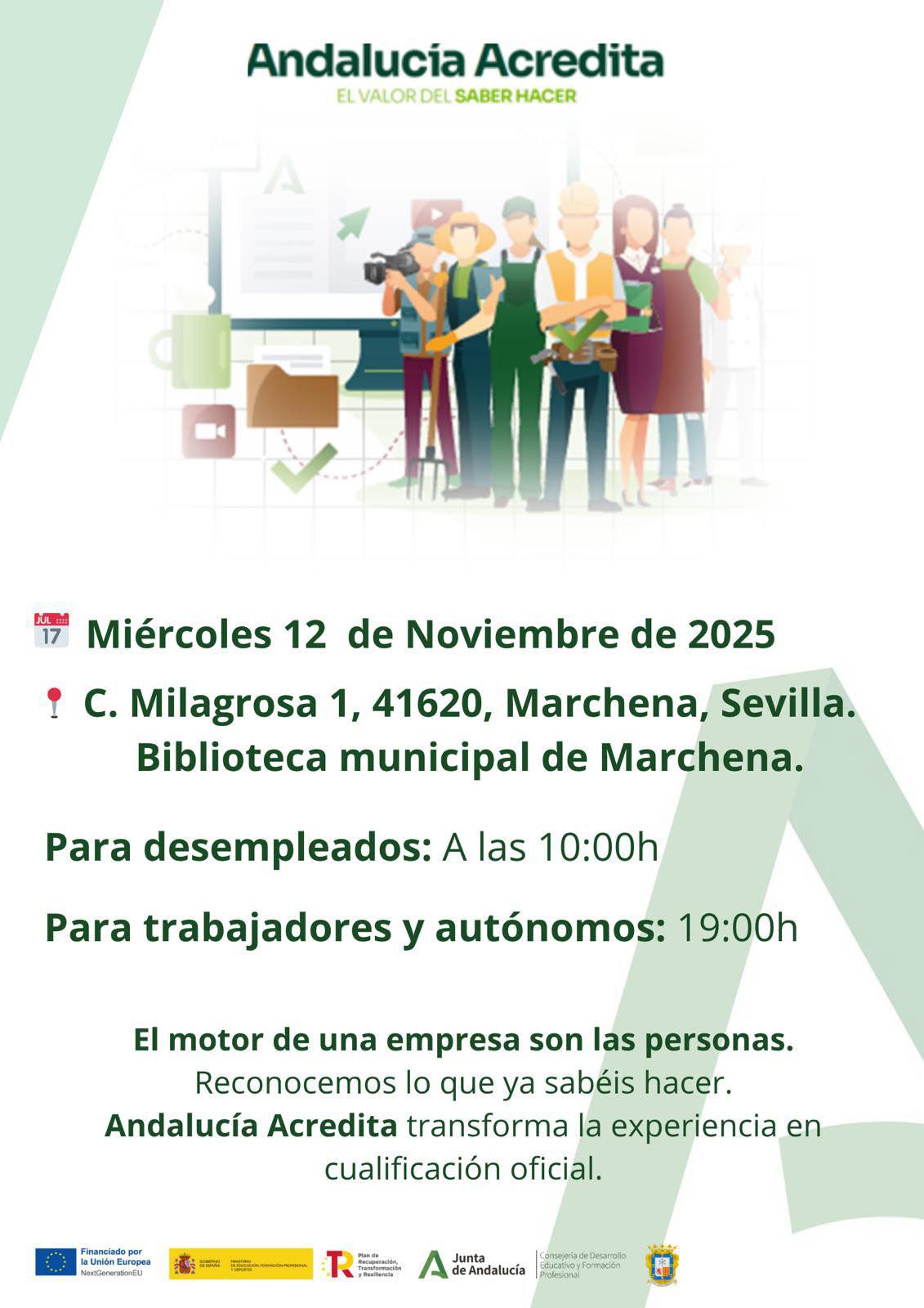 La Biblioteca Municipal de Marchena acogerá el próximo miércoles 12 de noviembre dos sesiones informativas sobre el programa ‘Andalucía Acredita’, impulsado por la Junta de Andalucía. Esta iniciativa permite obtener una acreditación oficial de las competencias profesionales adquiridas a través de la experiencia laboral o de la formación no formal. Las reuniones, con entrada libre, se celebrarán en las instalaciones de la biblioteca, situadas en la calle Milagrosa 1.