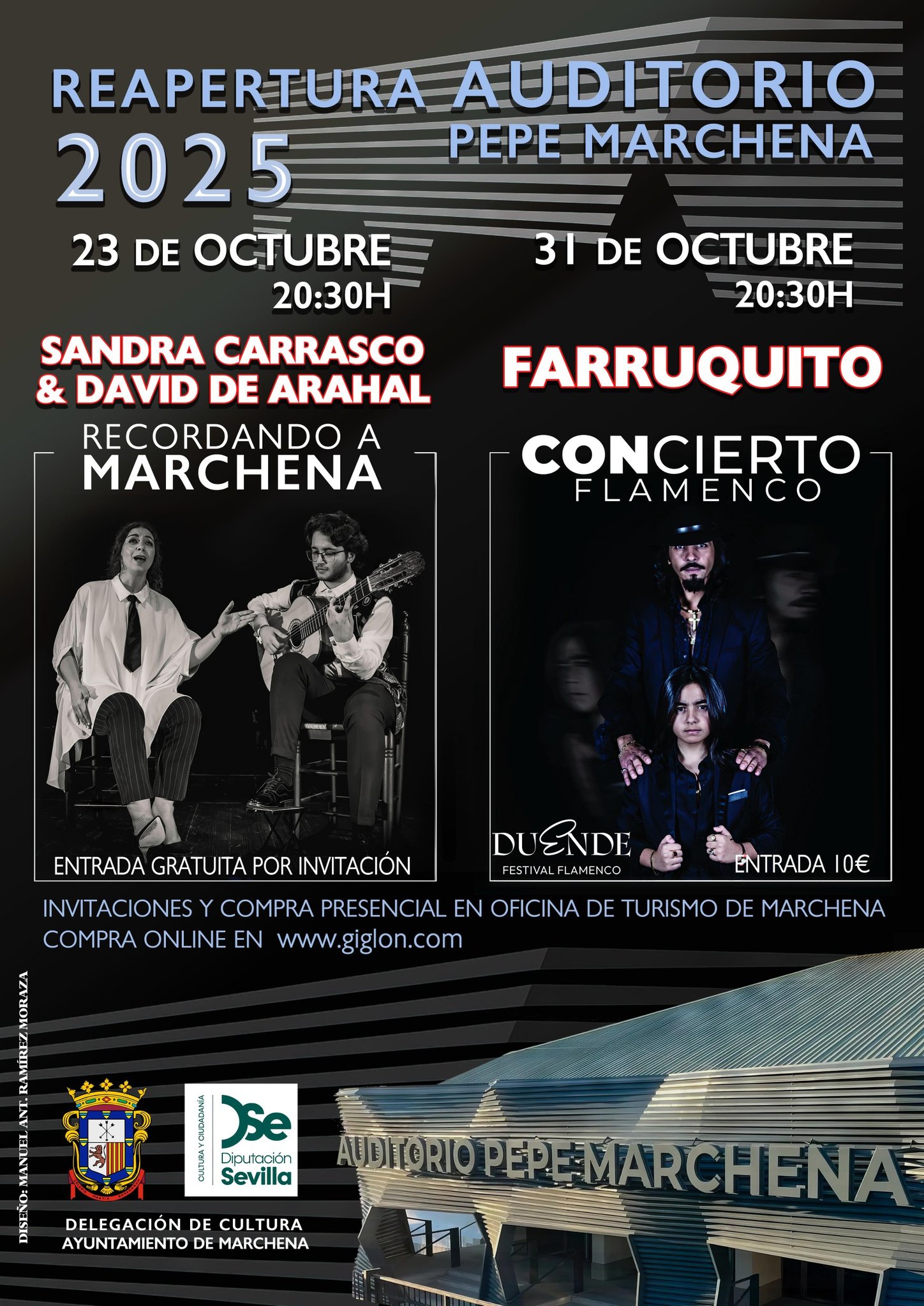 El Auditorio ‘Pepe Marchena’ reabre sus puertas con dos grandes espectáculos que marcarán un antes y un después en la programación cultural de la localidad. La cantante Sandra Carrasco y el guitarrista David de Arahal serán los primeros en subir al escenario el 23 de octubre con ‘Recordando a Marchena’, mientras que el bailaor Farruquito cerrará el mes con su espectáculo ‘Con-Cierto Flamenco’ el día 31, dentro del nuevo Festival Flamenco ‘Duende’ impulsado por la Diputación de Sevilla.