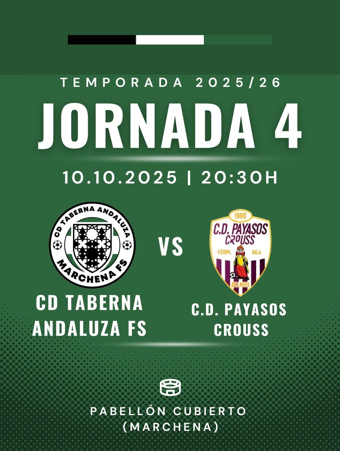El 'Taberna Andaluza FS' disputará este viernes 10 de octubre la 4ª jornada de la temporada 2025/26, recibiendo al 'CD Payasos Crouss' a las 20:30 horas en el Pabellón Cubierto de Marchena.