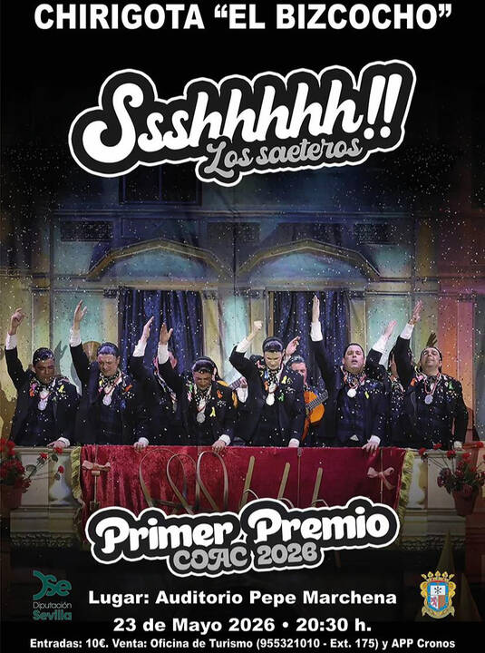 La aclamada chirigota llega a Marchena como parte de su gira nacional 'Saetas On Tour' y aterrizará en el municipio avalada por el máximo galardón del Concurso Oficial de Agrupaciones Carnavalescas (COAC) 2026. Bajo el nombre Ssshhhhh!! (Los Saeteros), el conjunto ha triunfado en el Gran Teatro Falla de Cádiz gracias a un repertorio innovador y un humor incisivo que presentarán ante el público marchenero.