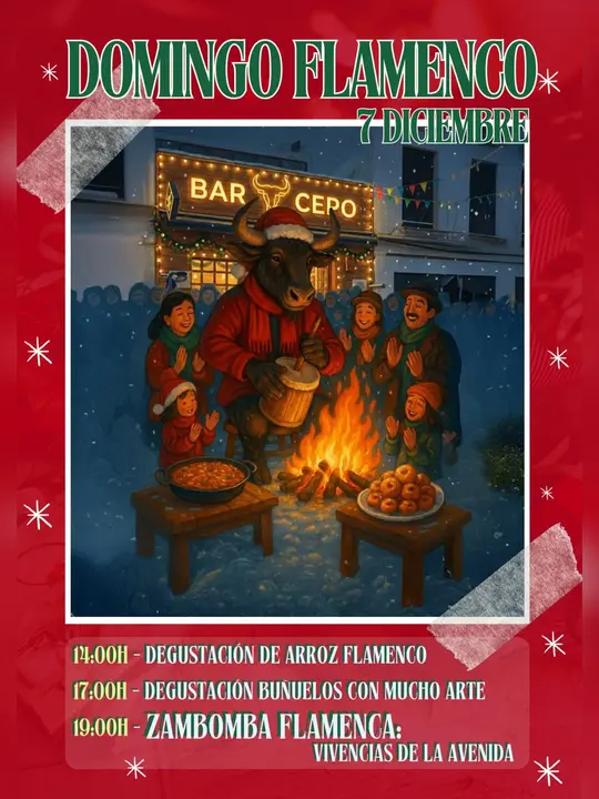El 'Bar Cepo' ha programado para este domingo 7 de diciembre en Marchena un domingo flamenco con varias actividades distribuidas a lo largo del día. La propuesta incluye una degustación, una merienda y una zambomba, cada una con horario definido.