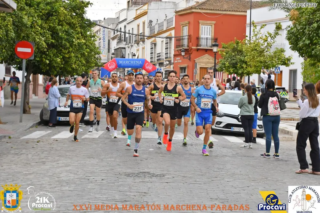 Marchena volvió a vivir este domingo una jornada de deporte y emoción con la celebración de la XXVI Media Maratón Marchena-Paradas, una prueba ya consolidada en el calendario andaluz. El marchenero Pablo Melero Cívico, del club ASM, se proclamó vencedor absoluto con un tiempo oficial de 1 hora, 11 minutos y 24 segundos, seguido muy de cerca por su compañero de club Antonio Burgos Lebrija (1:12:37). Completó el podio general Said El Bouchikhi, del Maratón Marchena, con un crono de 1:14:08.