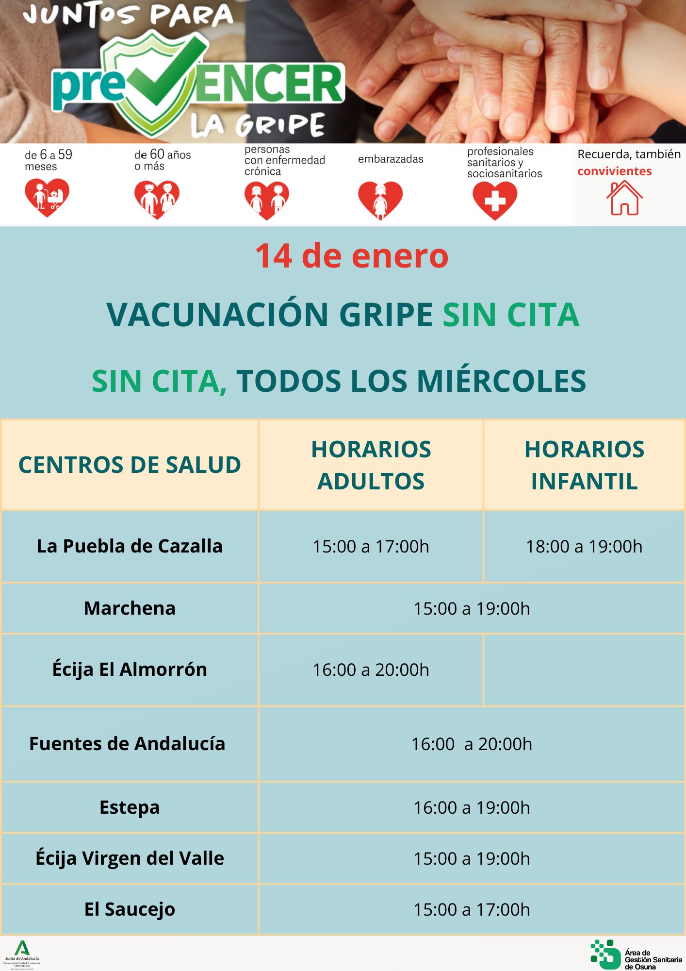 El centro de salud de Marchena habilitará este miércoles 14 de enero una jornada especial de vacunación contra la gripe sin necesidad de pedir cita previa, dentro de la campaña impulsada por el sistema sanitario público andaluz para reforzar la prevención durante el invierno.