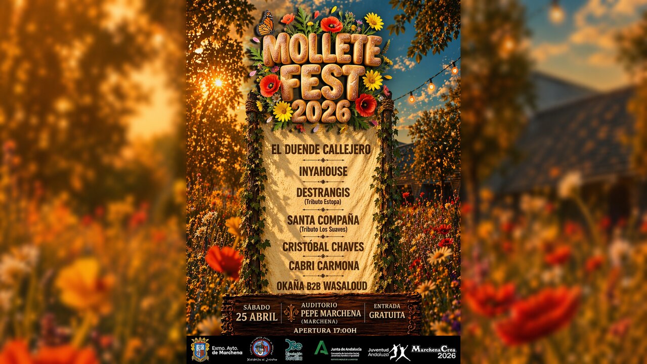 El Auditorio Pepe Marchena celebrará el próximo sábado 25 de abril una nueva edición del Mollete Fest 2026, un evento musical que cuenta con la participación del Ayuntamiento de Marchena, la Diputación de Sevilla y la Junta de Andalucía. La organización ha confirmado que la apertura de puertas se realizará a las 17:00 horas y que el acceso al recinto será mediante entrada gratuita hasta completar el aforo. La programación técnica del festival integra siete propuestas artísticas que transitan entre el pop, el rock y la música electrónica.