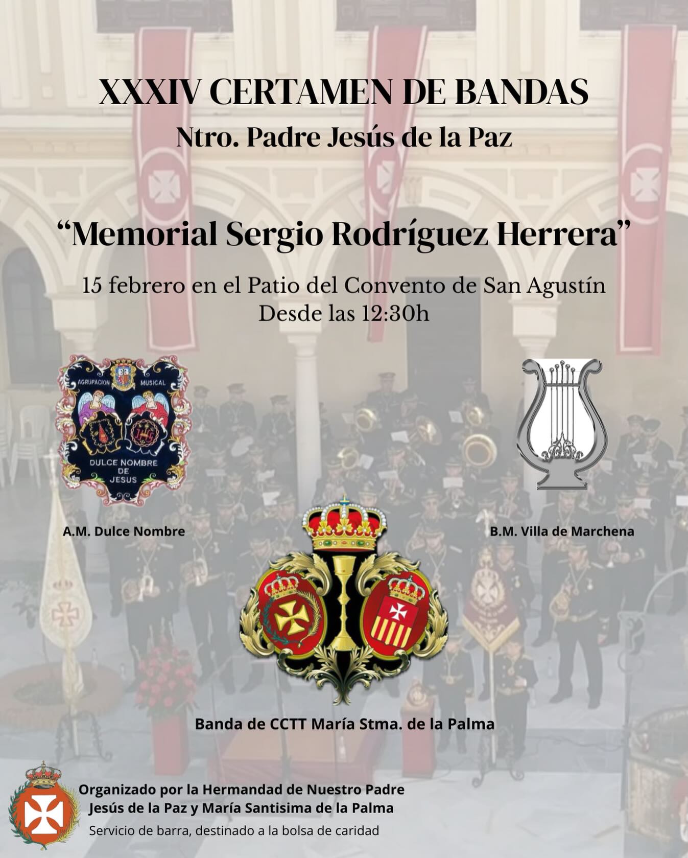 Marchena acogerá el próximo 15 de febrero una nueva edición del Certamen de Bandas ‘Nuestro Padre Jesús de la Paz – Memorial Sergio Rodríguez Herrera’, una cita ya consolidada que volverá a convertir el patio del Convento de San Agustín en punto de encuentro para los amantes de la música cofrade.
