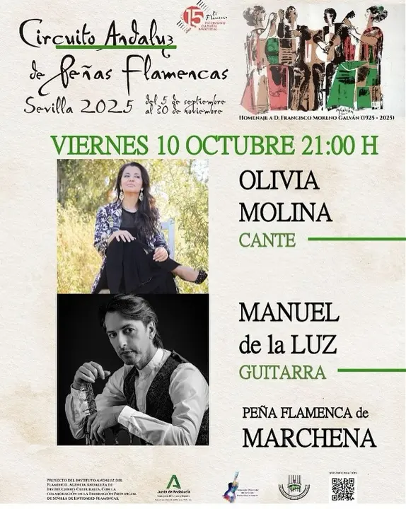 En esta ocasión, el escenario marchenero contará con la voz de Olivia Molina al cante y el acompañamiento de Manuel de la Luz a la guitarra, dos artistas de reconocida trayectoria que ofrecerán una velada de puro arte flamenco.