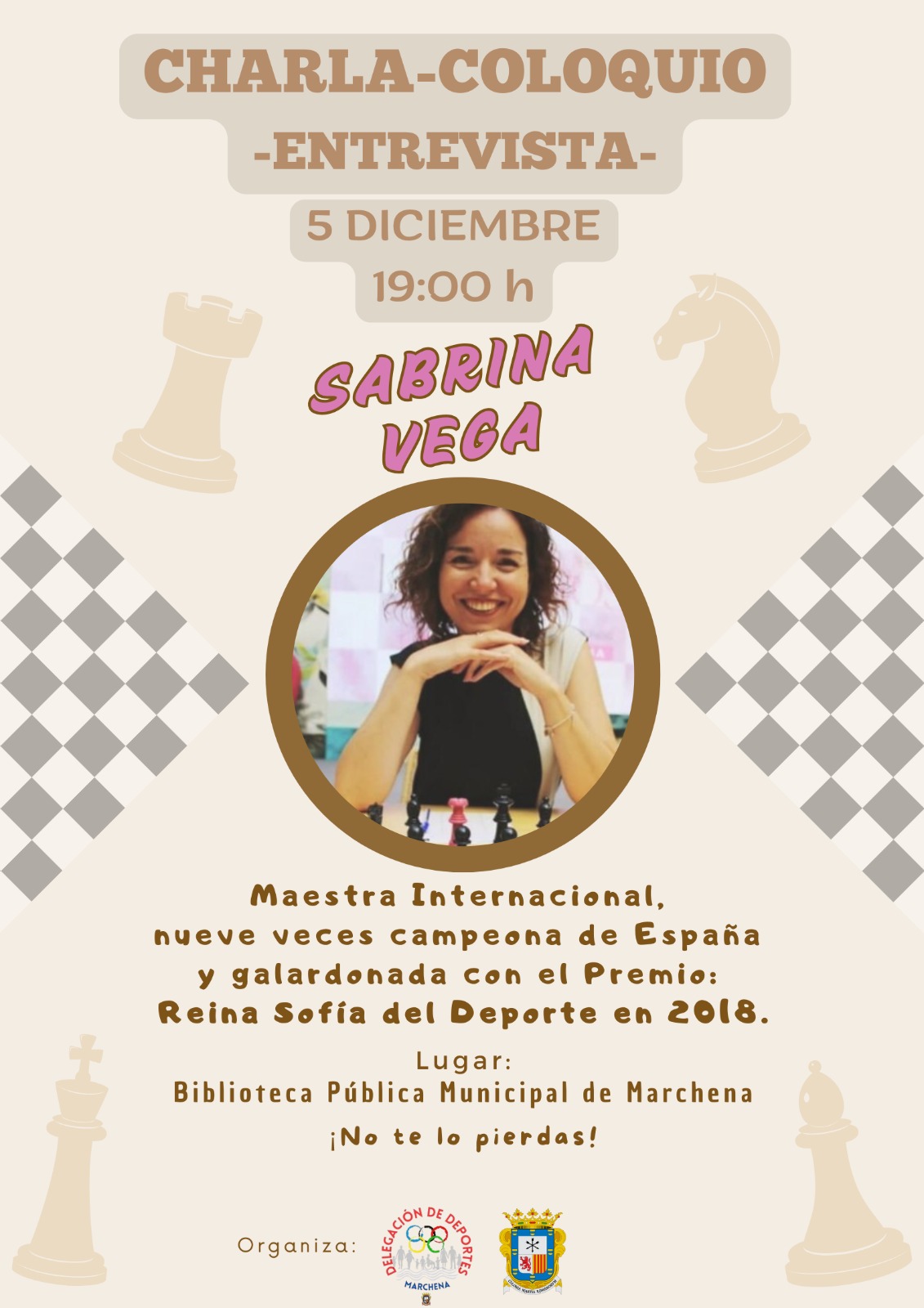 Marchena vivirá este viernes una jornada previa muy especial dentro de la programación del 36º Abierto Internacional de Ajedrez ‘Villa de Marchena’, con la celebración de una charla-coloquio a cargo de la reconocida ajedrecista Sabrina Vega. El encuentro tendrá lugar en la Biblioteca Pública Municipal a las 19:00 horas y se plantea como una actividad abierta para aficionados y público general.