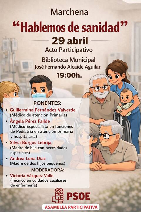 Marchena celebrará el próximo miércoles 29 de abril un acto participativo bajo el título 'Hablemos de sanidad', una iniciativa diseñada para analizar la realidad del sistema sanitario desde diversas perspectivas. El encuentro, que tendrá lugar en la Biblioteca Municipal 'José Fernando Alcaide Aguilar' a partir de las 19:00 horas, se plantea como una asamblea abierta donde profesionales del sector y usuarios podrán intercambiar experiencias y propuestas. Organizado por el PSOE de Marchena, el evento busca generar un espacio de debate crítico sobre la gestión de la salud pública y el estado de los servicios asistenciales en el municipio.