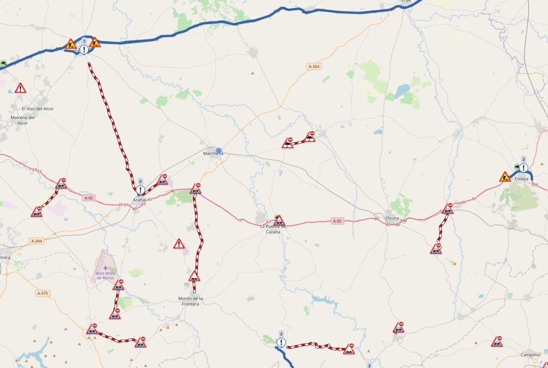 Según la actualización de la Dirección General de Tráfico realizada esta mañana, permanecen cortadas al tráfico varias carreteras de la red autonómica y secundaria en la provincia. Las vías afectadas se localizan en los entornos de Monte-Palacio (A-361), Morón de la Frontera (A-406 y SE-437), El Saucejo (A-451R1), Carmona (A-8100), Coripe (A-8126), Valdezorras en Sevilla capital (SE-3102), Alcolea del Río (SE-4104), Arahal (SE-5102), La Gironda (SE-5203), Marchena (SE-7201), Algámitas (SE-9225) y Osuna (SE-485).