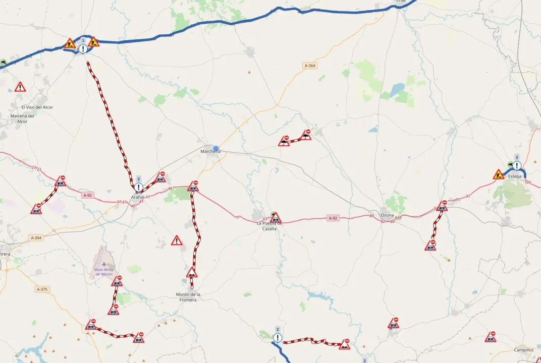 Según la actualización de la Dirección General de Tráfico realizada esta mañana, permanecen cortadas al tráfico varias carreteras de la red autonómica y secundaria en la provincia. Las vías afectadas se localizan en los entornos de Monte-Palacio (A-361), Morón de la Frontera (A-406 y SE-437), El Saucejo (A-451R1), Carmona (A-8100), Coripe (A-8126), Valdezorras en Sevilla capital (SE-3102), Alcolea del Río (SE-4104), Arahal (SE-5102), La Gironda (SE-5203), Marchena (SE-7201), Algámitas (SE-9225) y Osuna (SE-485).