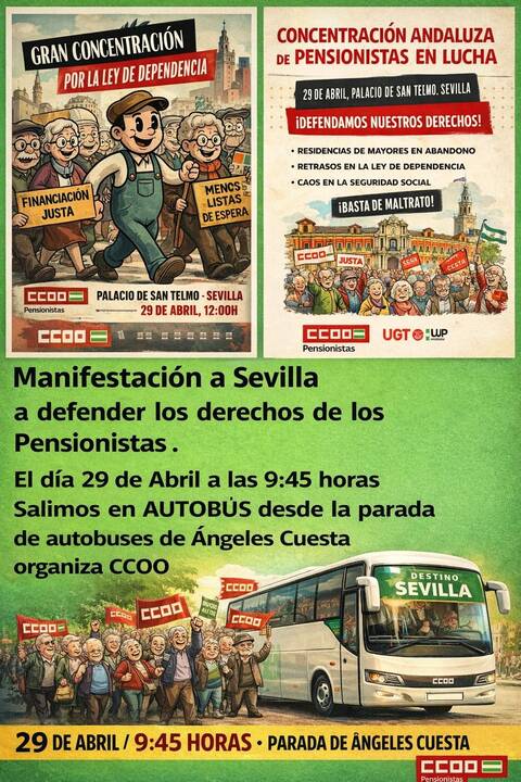 Los pensionistas de Marchena se desplazarán a Sevilla el próximo 29 de abril para participar en la gran concentración por la Ley de Dependencia. Organizada por CCOO, la expedición saldrá a las 9:45 horas desde la parada de autobús del colegio 'Ángeles Cuesta'. La movilización busca denunciar ante el Palacio de San Telmo el colapso en la gestión de las ayudas, los retrasos en las listas de espera y la situación de las residencias, exigiendo una financiación justa para los servicios sociales de la provincia.