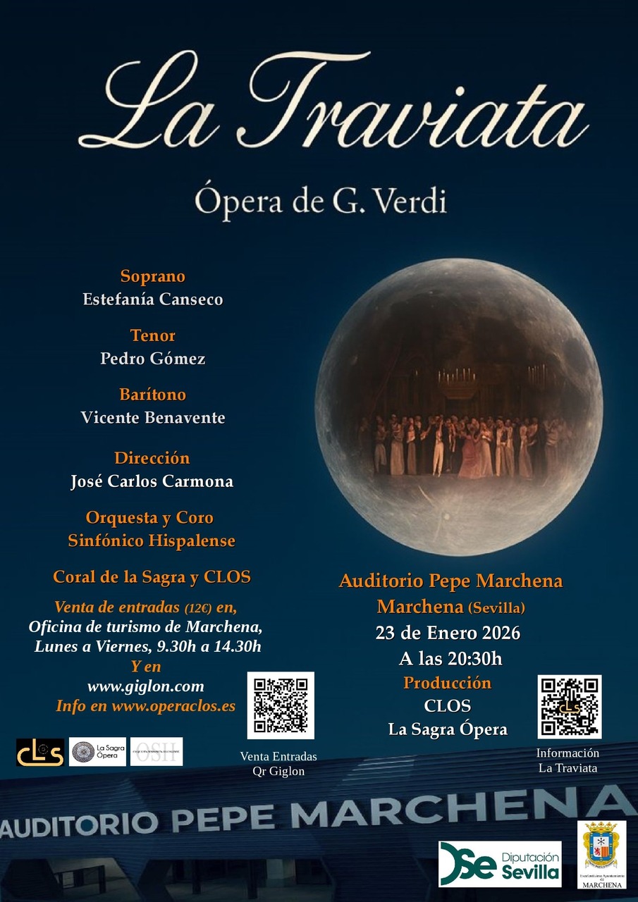 Marchena volverá a convertirse en escenario de una gran cita cultural con la representación de la ópera 'La Traviata' de Giuseppe Verdi el próximo 23 de enero de 2026 en el Auditorio 'Pepe Marchena'. La función dará comienzo a las 20:30 horas y contará con un reparto de primer nivel y una producción completa con orquesta y coro en directo.