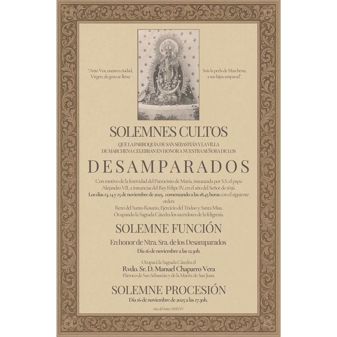La parroquia de San Sebastián Mártir de Marchena se prepara para celebrar los cultos en honor a Nuestra Señora de los Desamparados, con motivo de la festividad del Patrocinio de María, instaurada por el papa Alejandro VII en 1656 a instancias del rey Felipe IV.