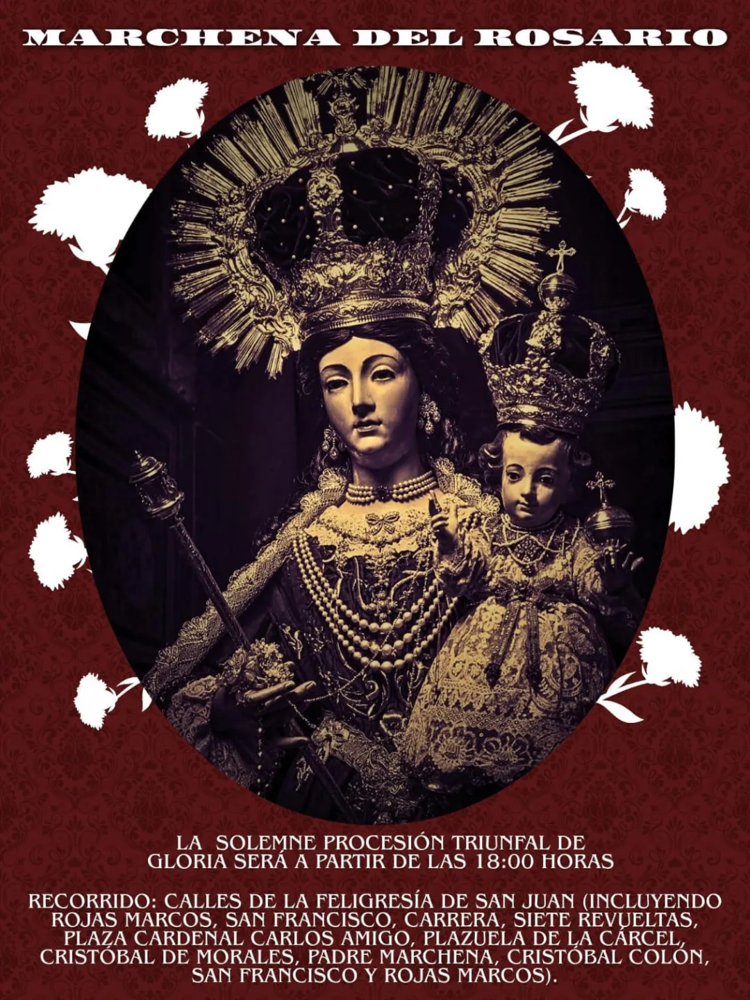 Ya por la tarde, a las 18:00 horas, se celebrará la Solemne Procesión Triunfal de Gloria de la Virgen del Rosario. La imagen saldrá desde la iglesia de Santo Domingo y recorrerá las calles de la feligresía de San Juan, pasando por Rojas Marcos, San Francisco, Carrera, Siete Revueltas, Plaza Cardenal Carlos Amigo, Plazuela de la Cárcel, Cristóbal de Morales, Padre Marchena, Cristóbal Colón, San Francisco y Rojas Marcos.