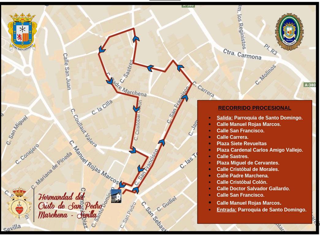 Prohibido Parar/Estacionar en Calles: Rojas Marcos, San Francisco, Doctor Salvador Gallardo, Pza Siete Revueltas (parte señalizada), Pza Carlos Amigo Vallejo, Pza Miguel de Cervantes, Cristobal de Morales y Padre Marchena desde las 15:00 horas hasta el paso de procesión.