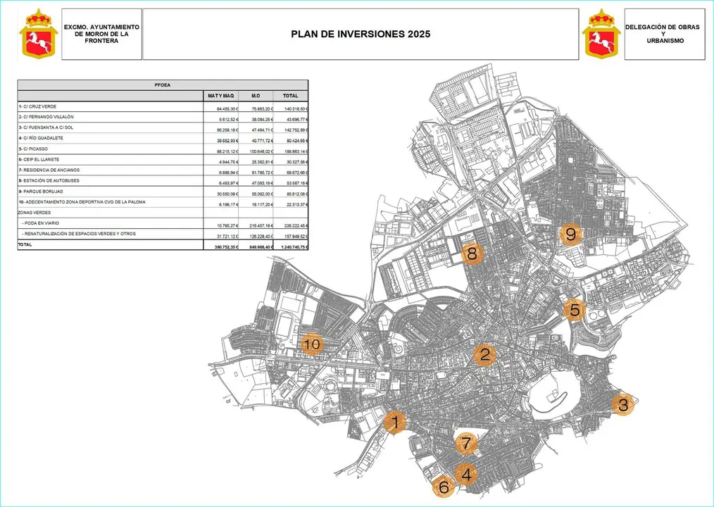Morón de la Frontera ha puesto en marcha el Plan PFEA 2025, un conjunto de actuaciones que se ejecutará entre diciembre de 2025 y octubre o noviembre de 2026. El programa cuenta con una inversión total de 1.240.740,75 euros, de los cuales 849.988,40 euros se destinarán a mano de obra, con financiación procedente de distintas administraciones y aportación municipal.