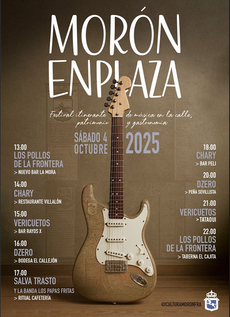 Morón de la Frontera acogerá este sábado 4 de octubre la segunda edición del festival ‘Morón EnPlaza’, una cita que combina música en directo y gastronomía en las calles de la localidad. El evento, que tuvo que aplazarse en dos ocasiones por la lluvia, podrá celebrarse finalmente con normalidad. El delegado de Cultura, Alfonso Luna, señaló que “ahora sí parece que vamos a poder desarrollarlo sin ningún problema”.