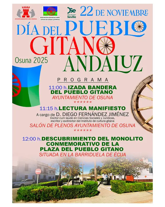 La jornada dará comienzo a las 11:00 horas con la izada de la bandera del Pueblo Gitano en la fachada del Ayuntamiento de Osuna. A continuación, se procederá a la lectura del manifiesto conmemorativo a cargo de Diego Fernández Jiménez, doctor cum laude en Ciencias Sociales y Jurídicas, escritor y exdirector del Instituto de Cultura Gitana.