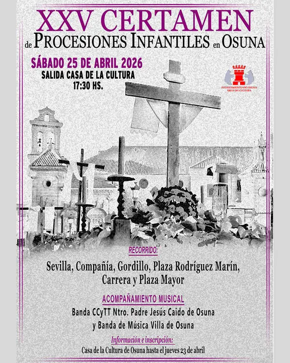 El Ayuntamiento de Osuna ha convocado para este sábado 25 de abril una de las citas más señaladas para la cantera cofrade de la localidad: el XXV Certamen de Procesiones Infantiles. Este evento, que alcanza sus bodas de plata, comenzará su itinerario a las 17:30 horas desde la Casa de la Cultura, punto de partida de un desfile que busca fomentar las tradiciones locales entre los más jóvenes. Los interesados en participar tienen de plazo para formalizar sus inscripciones en la propia Casa de la Cultura hasta el próximo 23 de abril.
