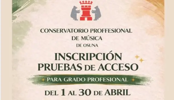 El Ayuntamiento de Osuna ha anunciado que continúa abierto el periodo de inscripción para las pruebas de acceso al Grado Profesional en el Conservatorio Profesional de Música de Osuna. Los estudiantes interesados en acceder a esta formación académica especializada tienen de plazo hasta el próximo 30 de abril para formalizar su solicitud. Esta convocatoria está diseñada para alumnos que buscan un entorno de enseñanza de calidad en una amplia variedad de disciplinas instrumentales, consolidando a la localidad como un referente educativo en la comarca.