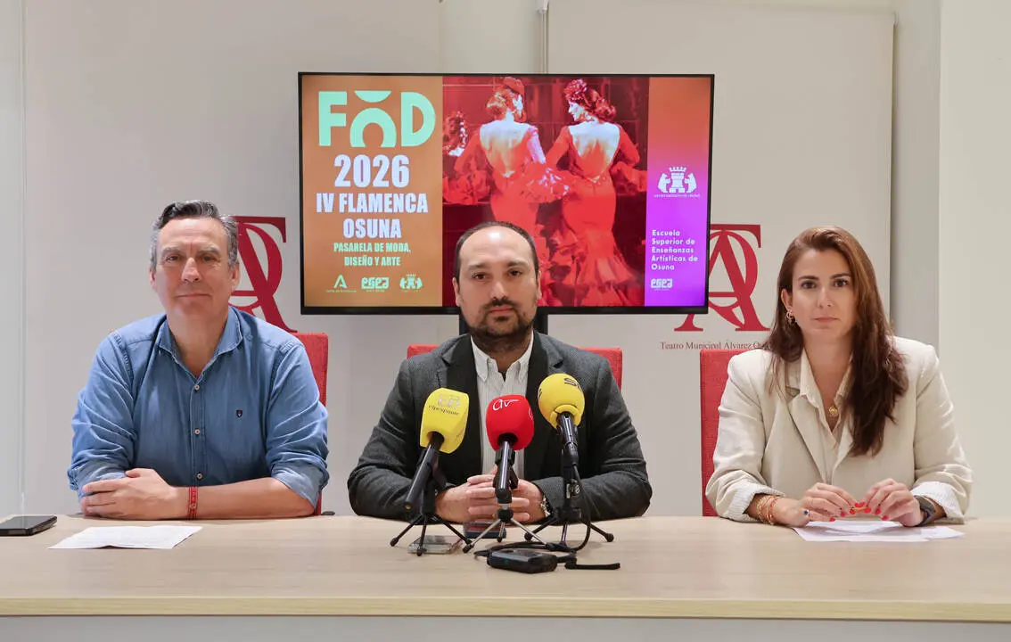 La Escuela Superior de Enseñanzas Artísticas de Osuna (ESEA) ha presentado la cuarta edición de Flamenca Osuna Diseño (FOD 2026). El desfile, que integra moda, diseño y arte, se celebrará el próximo 7 de mayo en la Plaza Rodríguez Marín. El acto de presentación ha contado con la participación del delegado municipal de Universidad, Jesús Heredia, el director de la Escuela Universitaria, Carlos Chavarría, y la coordinadora del Grado de Diseño de Moda, Mercedes Ruiz. Esta pasarela se traslada al corazón del casco histórico para convertir el espacio público en un centro de creación contemporánea justo antes del inicio de la Feria de Osuna.