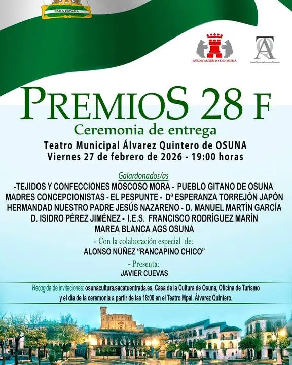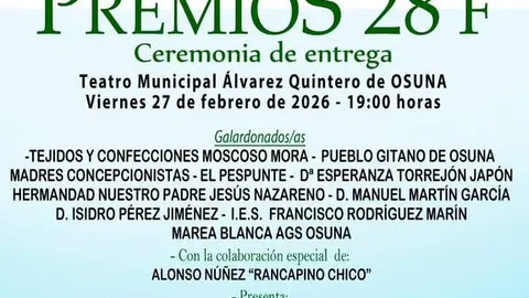 El Ayuntamiento de Osuna celebrará el próximo viernes 27 de febrero de 2026 la ceremonia pública de entrega de los Premios 28F, un acto institucional con el que el municipio conmemora el Día de Andalucía y reconoce trayectorias, entidades y colectivos destacados de la localidad.
