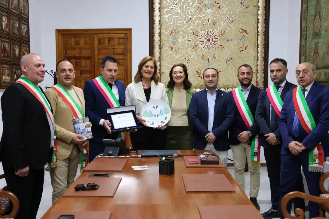 La alcaldesa de Osuna, Rosario Andújar, ha presidido este 24 de abril una recepción oficial a la cónsul de los Países Bajos en Cerdeña, Cristina Ricci, y a una delegación de once alcaldes de la Unione dei Comuni di Anglona. El encuentro, celebrado en el Ayuntamiento, ha servido para profundizar en las raíces históricas que unen a la localidad sevillana con el territorio sardo a través de la figura de la duquesa de Osuna, María Josefa Pimentel, quien ostentó el título de princesa de Anglona en el siglo XVIII.