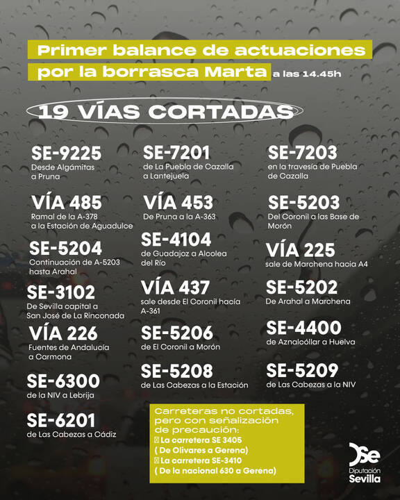 El primer balance provincial confirma que 19 carreteras de la red de la Diputación de Sevilla permanecen cortadas al tráfico. Las vías afectadas son las siguientes: