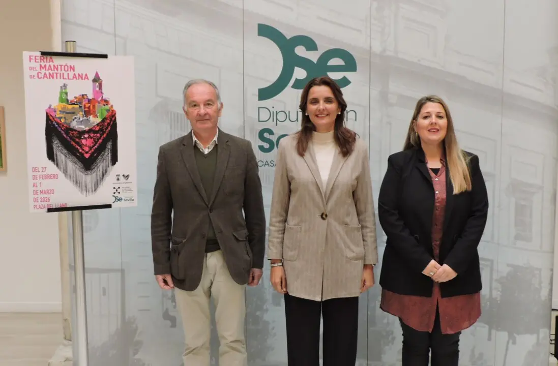 La alcaldesa de Cantillana, Rocío Capos, junto a la delegada municipal de Cultura, Asunción García, y el delegado municipal de Desarrollo, Manuel Camacho, han presentado este lunes en la Casa de la Provincia de la Diputación, la II Feria del Mantón de Cantillana, una cita que se celebrará del 27 de febrero al 1 de marzo de 2026 en la Plaza del Llano, en horario de 11:00 a 20:00 horas.