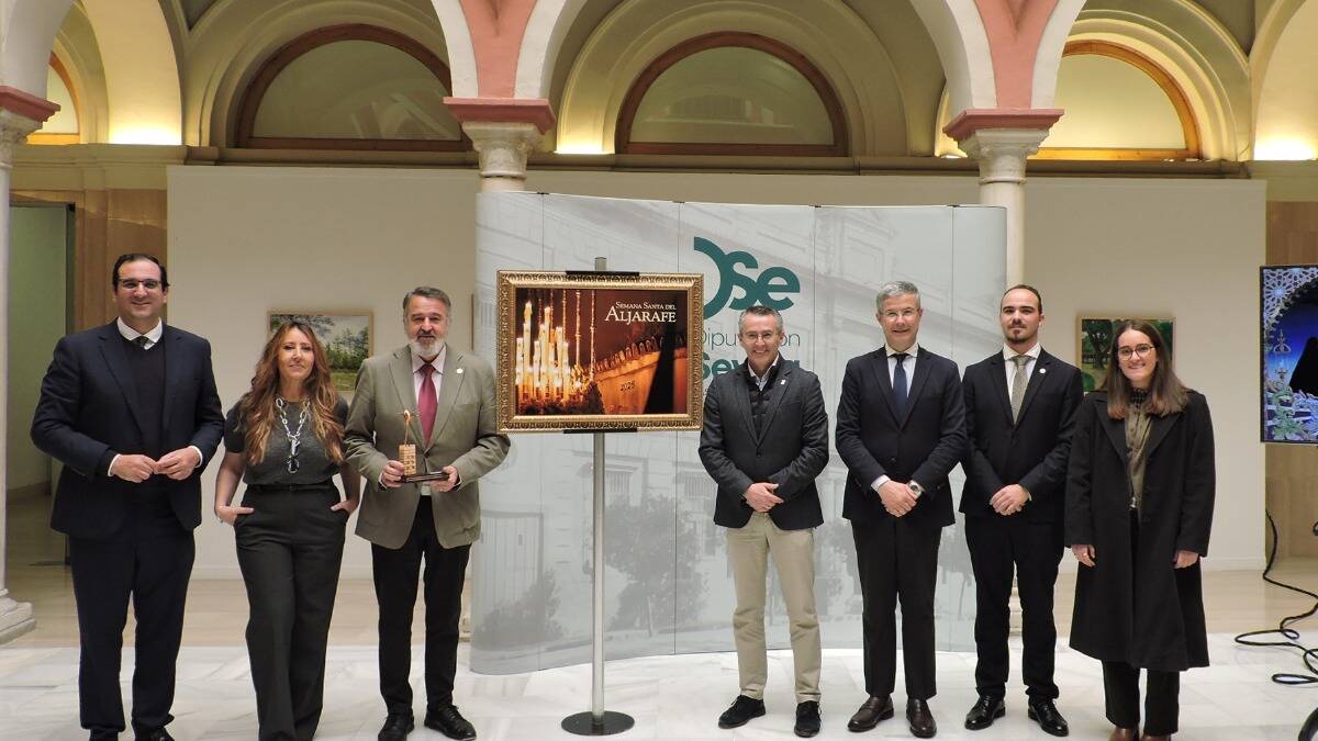 En la Casa de la Provincia de la Diputación de Sevilla se han dado cita hoy el diputado provincial del Partido Popular, Martín Torres, y los alcaldes de Villanueva del Ariscal y Valencina de la Concepción, Francisco García y Ramón Peña, respectivamente, quienes han acompañado a los responsables de la Asociación Cultural Lauretum, promotores de la iniciativa, y al artista Manuel Castro, en la presentación del Cartel de la Semana Santa del Aljarafe 2026.