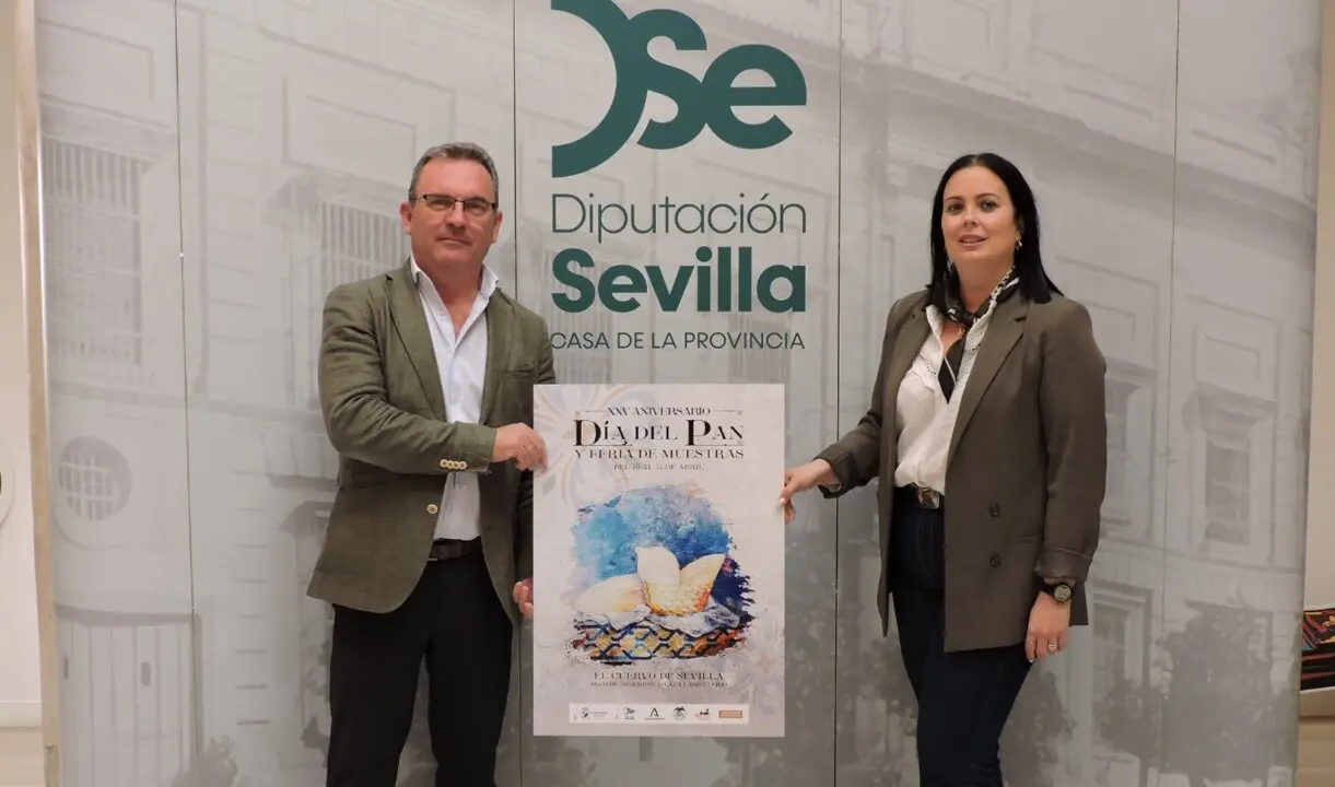 El alcalde de El Cuervo de Sevilla, José Manuel Oliva Arellano, y la delegada municipal de Innovación, Promoción y Empleo, María Carmen Vega Barroso, han presentado en la Casa de la Provincia de la Diputación el cartel y la programación del XXV Día del Pan y Feria de Muestras de El Cuervo, que se celebra el próximo fin de semana, del 10 al 12 de abril, con una completa propuesta de actividades para todos los públicos.