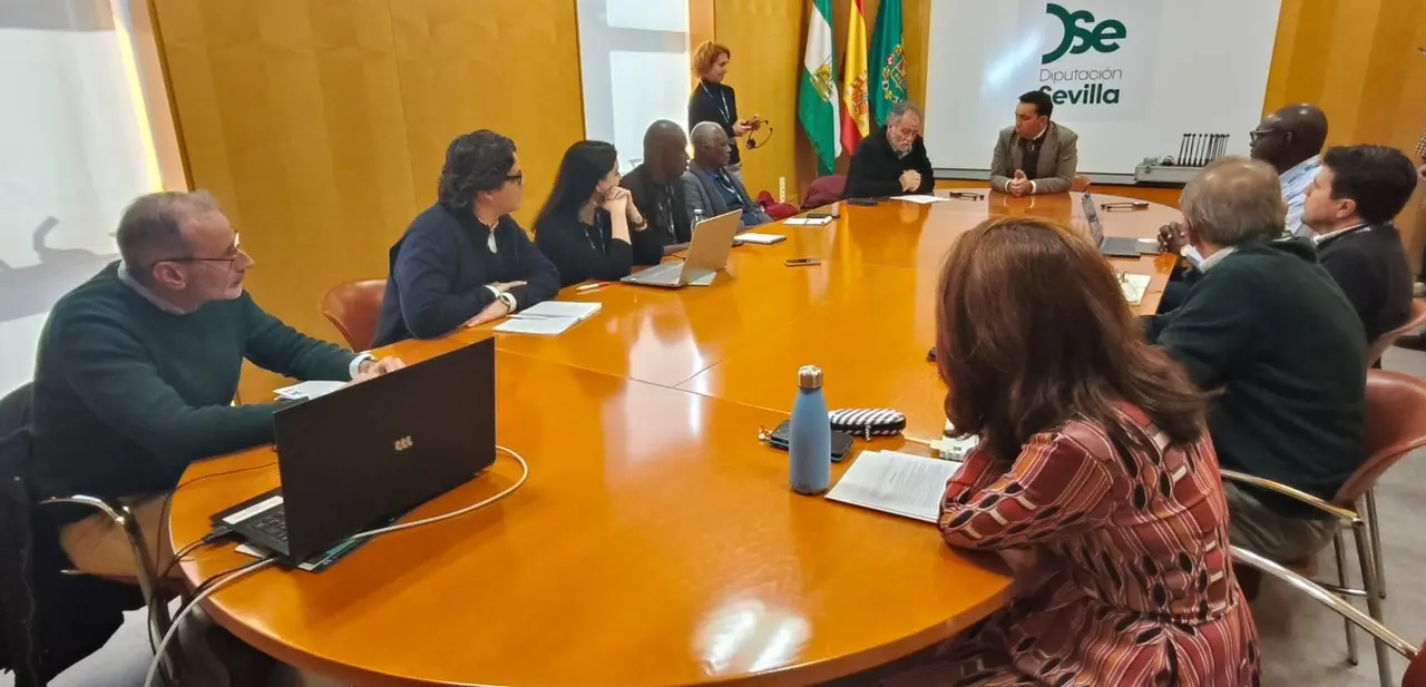 El diputado provincial de Servicios Públicos Supramunicipales, Gonzalo Domínguez, ha recibido hoy en la Sede de la Diputación de Sevilla a una delegación de representantes de varias instituciones locales y entidades dedicadas al desarrollo regional de Senegal, con los que ha mantenido una reunión de trabajo que ha incluido al Equipo directivo y técnico del Área y en la que la principal conclusión ha sido la intención de abrir una interlocución bilateral estable entre estas administraciones públicas senegalesas y la Diputación.