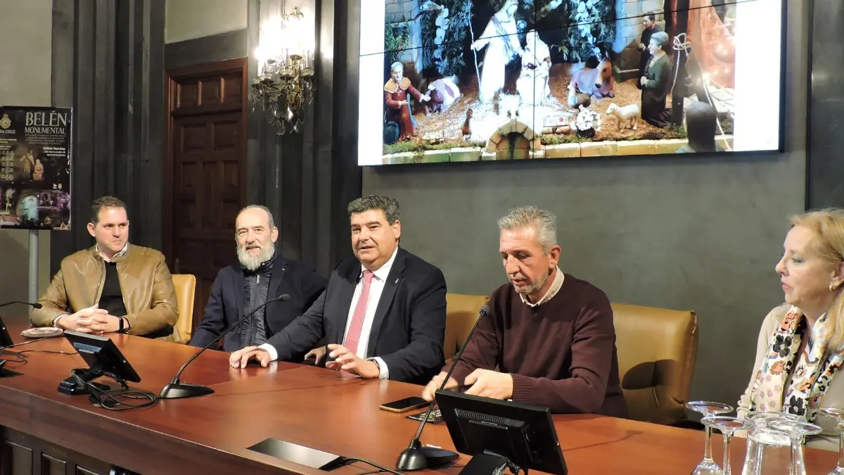 Representantes de la Hermandad de la Vera-Cruz de Alcalá del Río y del Ayuntamiento de la localidad han presentado este martes en la Casa de la Provincia de la Diputación el Belén Monumental que podrá visitarse de nuevo en el salón del Edificio Vera-Cruz, de forma gratuita, a partir del 4 de diciembre, cuando tendrán lugar la bendición e inauguración oficial.