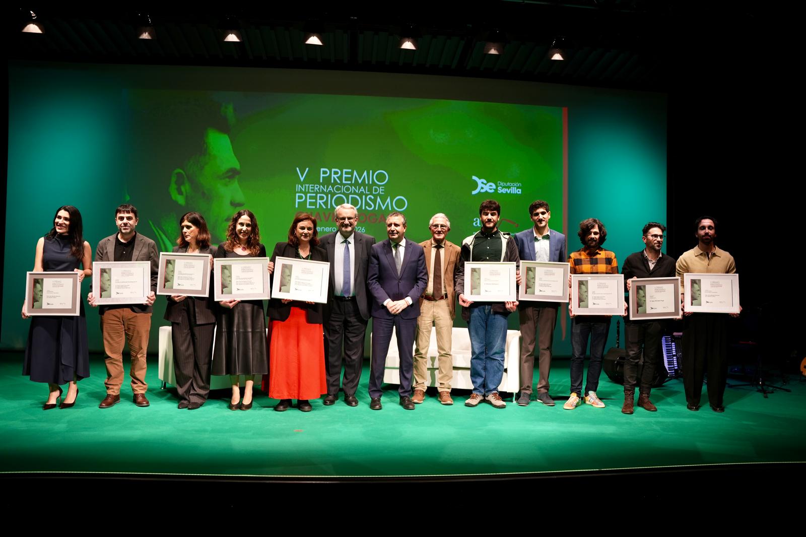 Los presidentes de la Diputación de Sevilla, Javier Fernández, y de la Asociación de la Prensa sevillana, Rafael Rodríguez, han pilotado la entrega del V Premio Internacional de Periodismo ‘Manuel Chaves Nogales’ que convocan ambas entidades, en un acto celebrado en el Auditorio CaixaForum Sevilla, con la periodista Mabel Mata como maestra de ceremonias y en el que no han faltado las condolencias, el recuerdo y el ánimo para las víctimas y para las personas heridas en los accidentes de Adamuz y en otras provincias españolas.