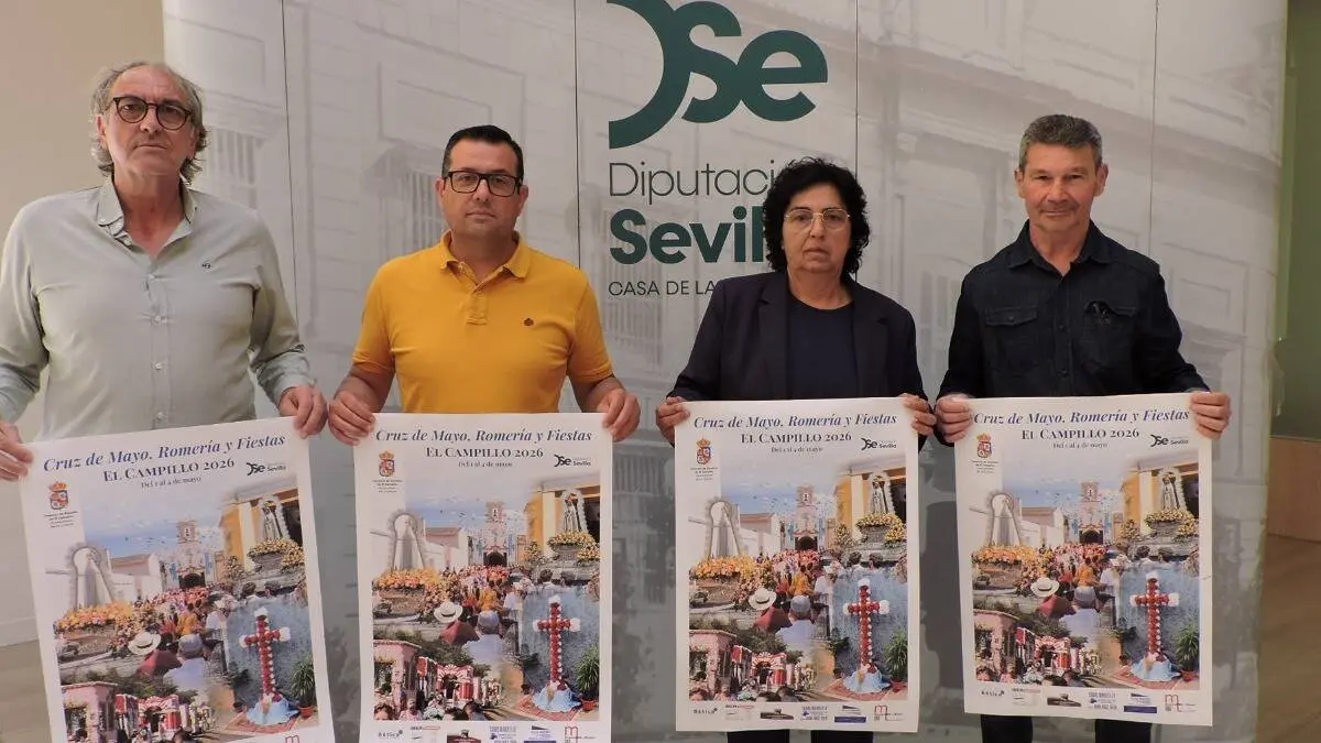 La alcaldesa de la localidad sevillana de La Luisiana, María del Valle Espinosa, acompañada por el primer teniente de Alcaldía de La Luisiana y El Campillo, Juan Manuel Rivero; el concejal de Cultura, Ignacio Mateo Selfa, y el presidente de la Hermandad de Amigos de Fátima de El Campillo, José Antonio Rivero, han presentado hoy en la Casa de la Provincia de la Diputación de Sevilla el cartel de las fiestas de la Romería de la Cruz y las Fiestas de El Campillo en honor de la Virgen de Fátima, que se celebrarán del 1 al 4 del próximo mes de mayo, con un programa de actividades para todos los públicos.