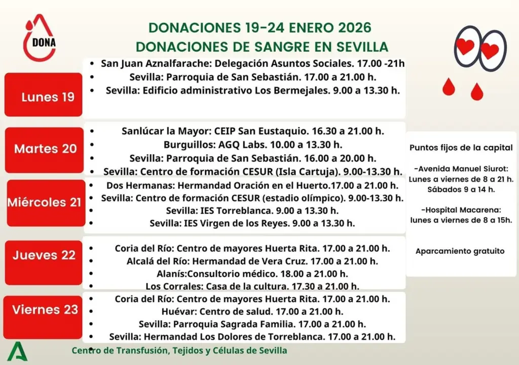 Además, se mantiene activo un amplio calendario de puntos de donación en distintos municipios de la provincia, coordinado por el Centro de Transfusión, Tejidos y Células de Sevilla.