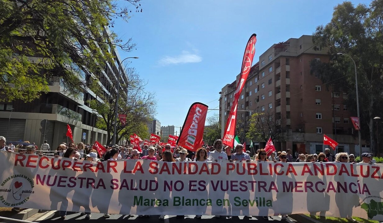 Unas 55.000 personas han tomado el centro de Sevilla este domingo, 12 de abril, en una multitudinaria marcha en defensa del sistema sanitario. La movilización busca frenar el deterioro de los servicios asistenciales y exigir medidas urgentes frente a las demoras clínicas que ponen en riesgo la vida de los pacientes.