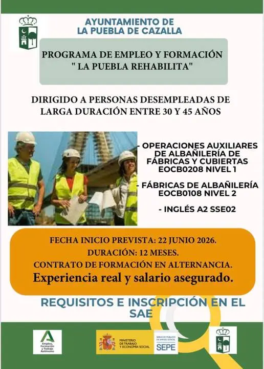 El Ayuntamiento de La Puebla de Cazalla ha puesto en marcha el proceso de selección para el nuevo programa de empleo y formación denominado La Puebla Rehabilita, cuya fecha de inicio está prevista para el próximo 22 de junio de 2026. Esta iniciativa institucional, que cuenta con la colaboración del Servicio Andaluz de Empleo (SAE), está diseñada específicamente para personas desempleadas de larga duración con edades comprendidas entre los 30 y los 45 años. El proyecto busca dinamizar el mercado laboral local mediante una fórmula que combina el aprendizaje teórico con la experiencia profesional remunerada en proyectos de rehabilitación urbana.