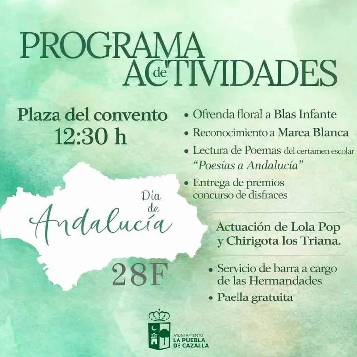 La Puebla de Cazalla celebrará el sábado 28 de febrero el Día de Andalucía con una jornada completa de actividades en la Plaza del Convento. El Ayuntamiento ha diseñado un programa que une el acto institucional con propuestas culturales y musicales abiertas a todos los vecinos.