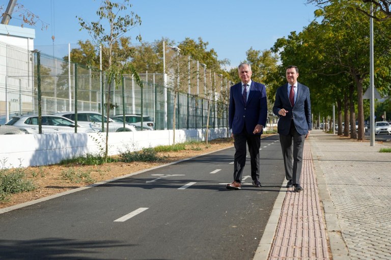 El alcalde de Sevilla, José Luis Sanz, ha comprobado el resultado de las obras que permitirán conectar San Jerónimo, desde la Avenida de la Biología; con la Avenida de Finlandia, en Los Bermejales, destacando que “seguimos trabajando para que Sevilla se mantenga entra las tres capitales españolas con más kilómetros de vías ciclistas. En estos cuatro años vamos a invertir más de 14 millones de euros para que la ciudad cuente con casi 18 kilómetros nuevos de carril bici”, situándose sólo por detrás de Barcelona y Zaragoza en cuanto a número de kilómetros.