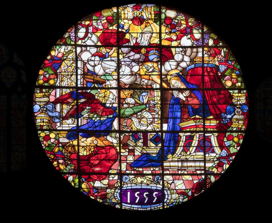 La vidriera de la Asunción de la Virgen, con un diámetro de 5,65 metros, está situada sobre la Puerta del Príncipe o de San Cristóbal. Fechada entre 156/1537 se atribuye a Arnao de Vergara, siendo la última de sus obras. Por su parte, el vitral de los Desposorios de la Virgen, en la capilla del Mariscal, se atribuye a Arnao de Flandes y está datado en 1556. La del Cardenal Ilundain y Esteban, ubicada en la capilla de Nuestra Señora de los Dolores, fue realizada por la Casa Maumejean, en 1932, en honor del cardenal por financiar en su día la restauración de las vidrieras catedralicias.