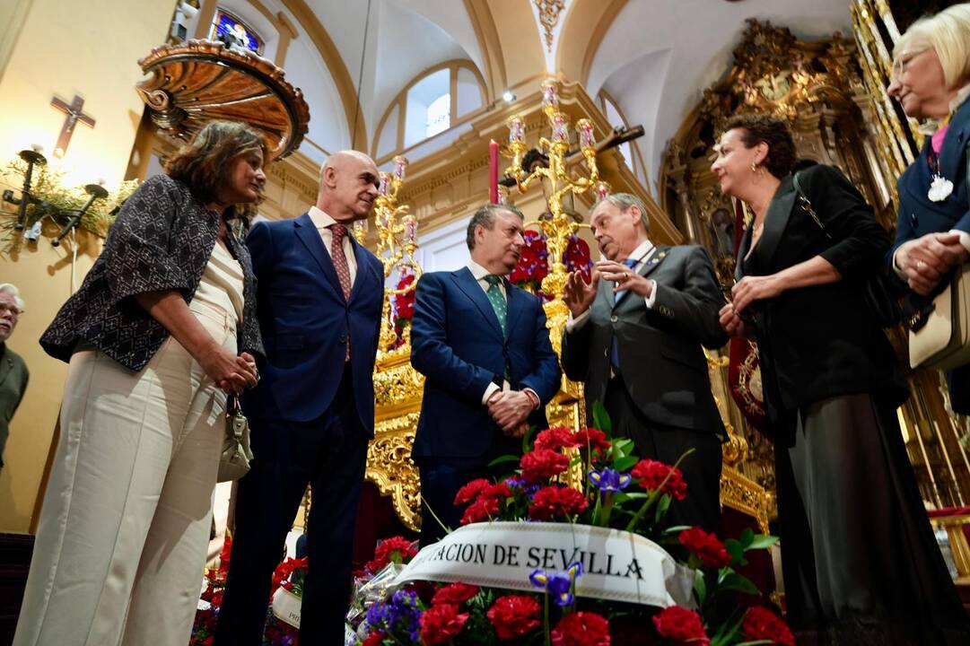 El presidente de la Diputación de Sevilla, Javier Fernández, ha realizado este Miércoles Santo la ya tradicional ofrenda floral a los titulares de la Hermandad de San Bernardo, horas antes de su salida procesional. Con este gesto, la institución provincial refuerza su cercanía y vínculo con una de las corporaciones más cercanas a la Diputación, por el barrio en el que tiene su sede.