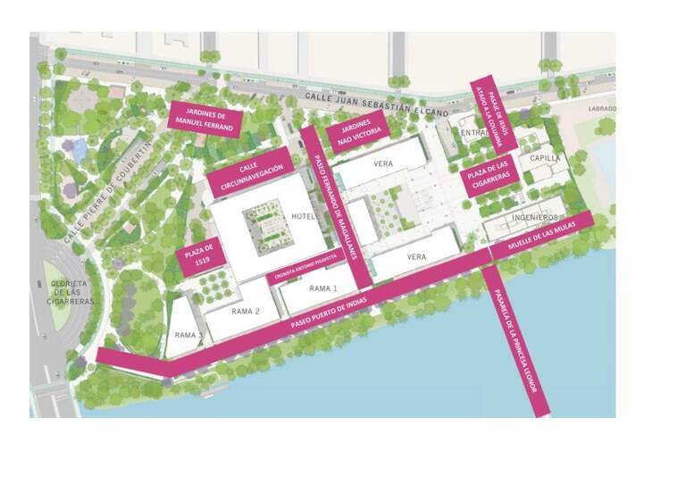 El eje central del desarrollo, delimitado por el futuro puente peatonal Princesa Leonor, estará marcado por arterias como el Paseo Puerto de Indias y el Muelle de las Mulas. Estas vías se conectarán mediante el Paseo Fernando de Magallanes con la actual avenida Juan Sebastián Elcano. Alrededor del nuevo complejo hotelero surgirán nomenclaturas dedicadas a la gesta naval, como la calle Circunnavegación, la Plaza de 1519 y la vía consagrada al cronista Antonio Pigafetta, además de los Jardines Nao Victoria. Por su parte, el entorno de la capilla religiosa adoptará los nombres de Plaza de las Cigarreras y Pasaje de Jesús Atado a la Columna.